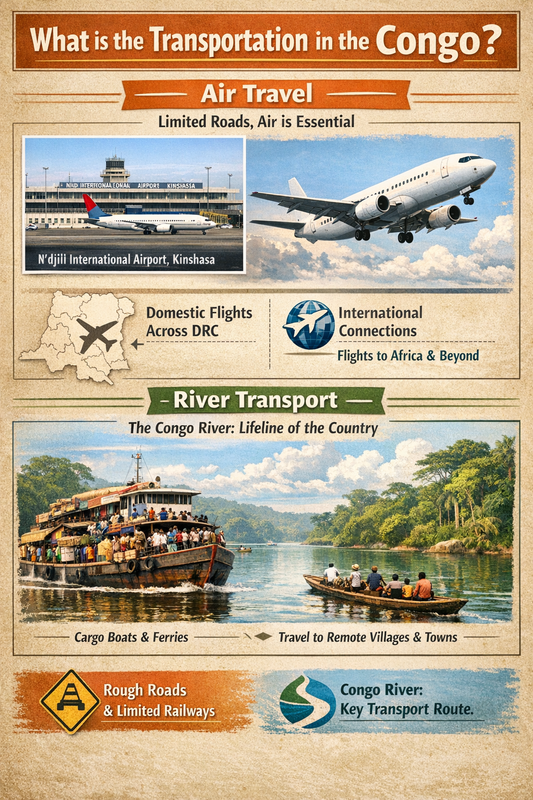 - River transport: The Congo River is a vital transportation artery, especially for long distances or remote regions.