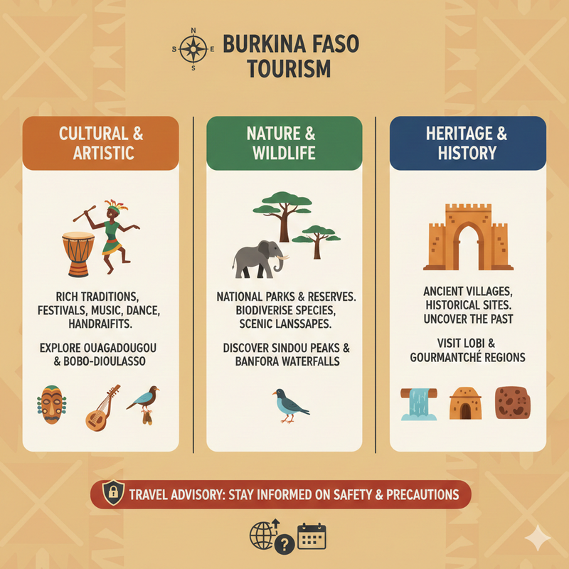 - Popular destinations include Ouagadougou, Bobo-Dioulasso, Sindou Peaks, Banfora waterfalls, and ancient villages.
