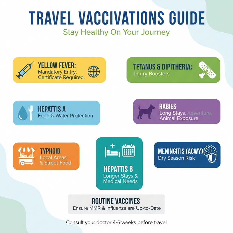 - Meningitis (ACWY) is suggested, particularly during the dry season when cases increase.