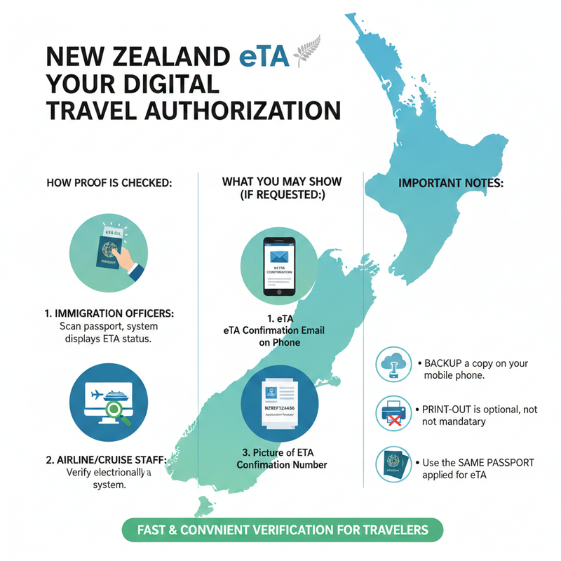 Providing evidence of your New Zealand eTA is quite easy as it is linked electronically to your passport. Most of the time you are not required to present a physical copy.