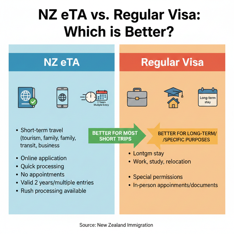 Choosing between an NZ eTA and a regular visa depends on the purpose and duration of travel. For most short trips, the NZ eTA is considered the better and more convenient option.