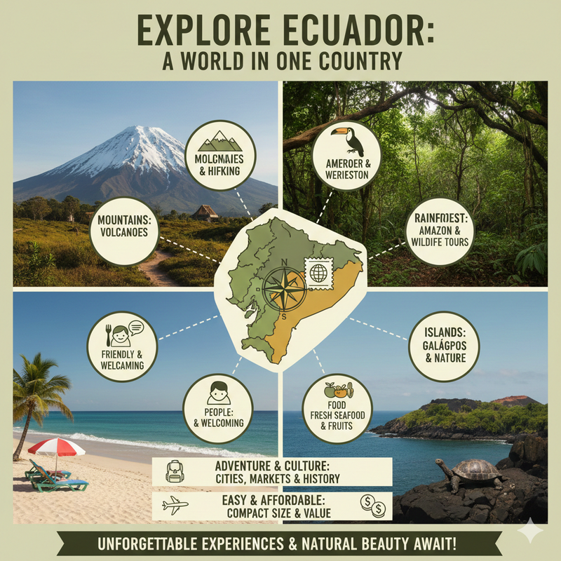 - Ecuador offers an incredible mix of mountains, beaches, rainforest, and islands all in one country.